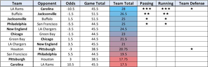 Every week, the first step of your DFS homework should be to examine the opening Vegas odds on all the NFL games for that week. Through some fairly simple algebra, it is easy to derive a spreadsheet that predicts team totals for every game, thereby allowing you to develop a rudimentary game script to help narrow down your decisions for the week.